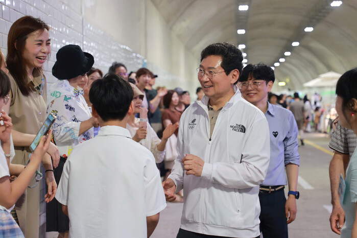 [용인=오왕석 기자] 이상일 용인특례시장은 19일 오후 수지구 지역 주민들의 자발적인 참여로 이뤄진 문화행사 ‘제3회 수지터널 페스티벌’에 참석해 축하와 응원의 메시지를 전하고 공연 프로그램을 지켜봤다.