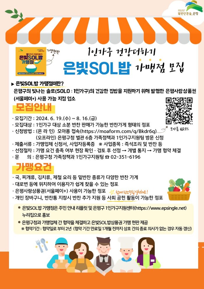‘은빛SOL밥’은 ‘은’평구의 ‘빛’나는 ‘SOL’O(1인가구)에게 건강한 집‘밥’을 지원한다는 의미의 은평구 특화사업으로, 1인가구 대상 소분 반찬 판매가 가능한 반찬가게 형태의 점포이며, 밑반찬 종류가 다양하고 대로변 등에 위치해 돌봄가구가 쉽게 찾을 수 있는 점포를 대상으로 가맹점을 모집한다고 30일 밝혔다.