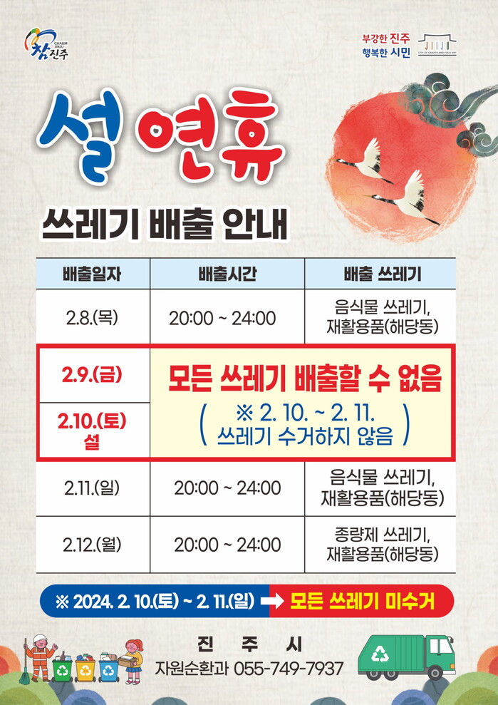 시 관계자는 “연휴 기간 중 2월 10일 토요일과 11일 일요일은 모든 쓰레기를 수거하지 않기 때문에 배출일을 꼭 지켜 줄 것을 당부드린다”고 말했다.