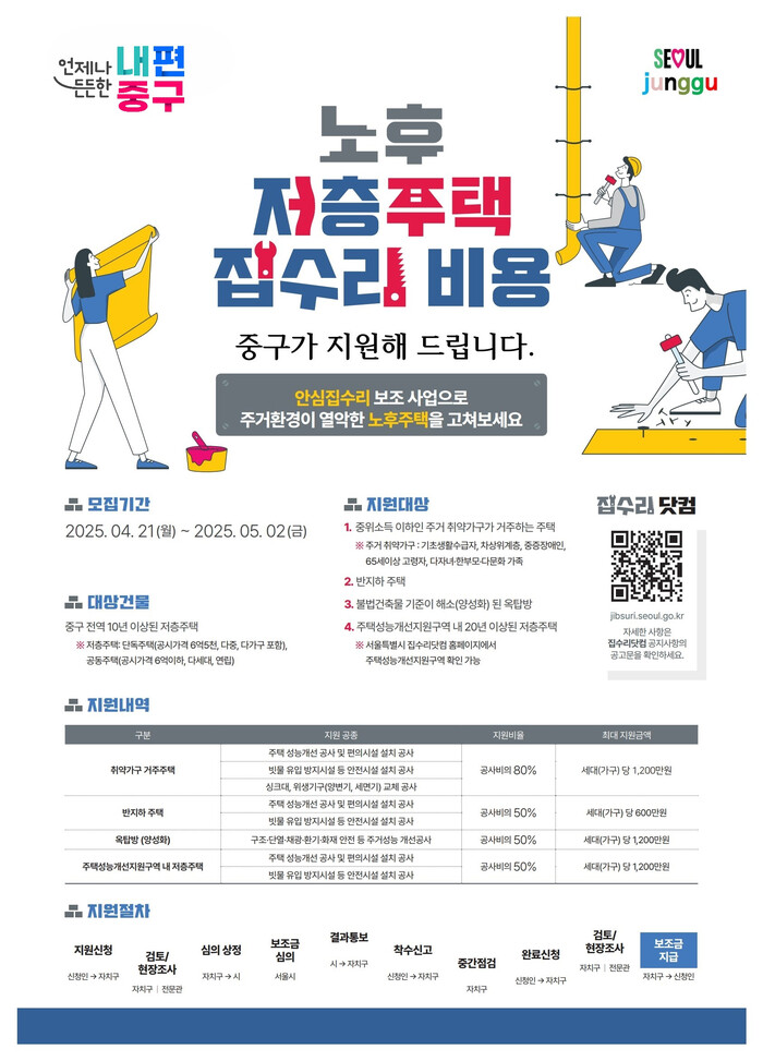 지원을 희망하는 가구는 신청서, 공사견적서 등을 5월2일까지 구청 주택과로 방문해 접수하면 된다. 관련 서식과 자세한 사항은 중구청 홈페이지 고시공고에서 확인할 수 있다.