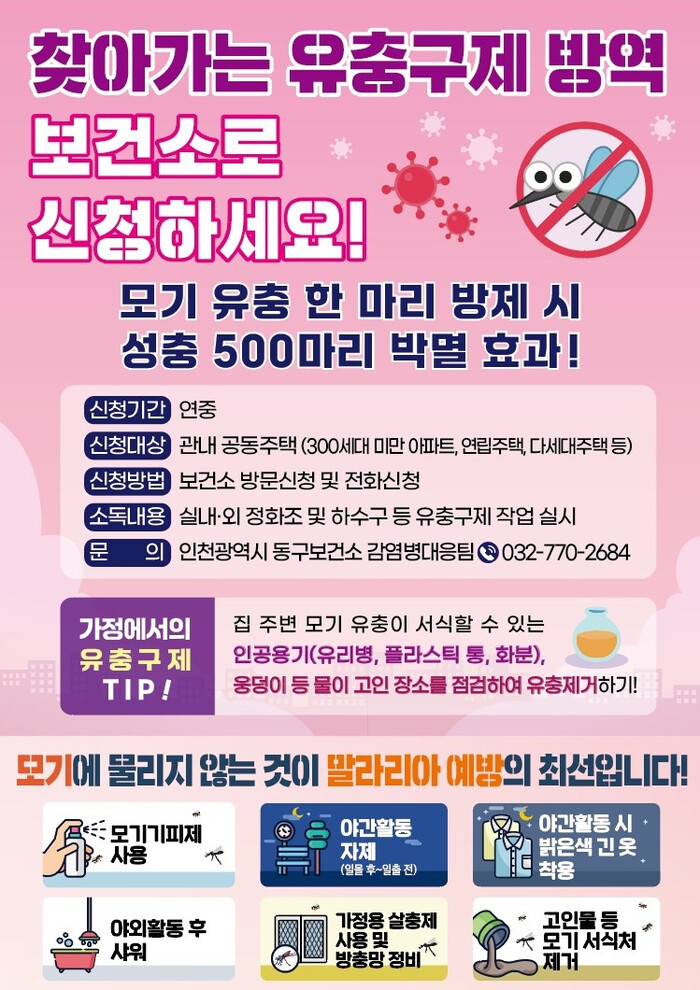 찾아가는 유충구제 방역사업 신청은 동구보건소 방문 및 전화를 통해 연 2회 신청 가능하며, 기타 자세한 사항은 보건소 감염병대응팀으로 문의하면 된다.