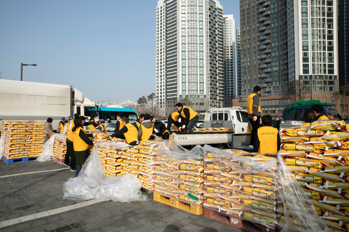 (사)성동구자원봉사센터가 최근 서울 성동구 뚝섬유수지 공영주차장에서 성동구상공회와 함께하는 ‘사랑의 쌀’ 나눔 행사를 개최했다. 사진은 행사에 참여한 봉사자들이 쌀을 직접 실어 나르는 모습. (사진=성동구청 제공)