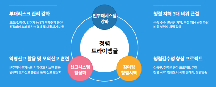 ‘청렴 트라이앵글’은 ▲부패를 사전적으로 예방하는 반부패시스템 강화 ▲부패 상황에 대응하는 신고시스템 활성화 ▲전 직원의 청렴 마인드 향상을 이끄는 참여형 청렴 시책으로 구성된다.