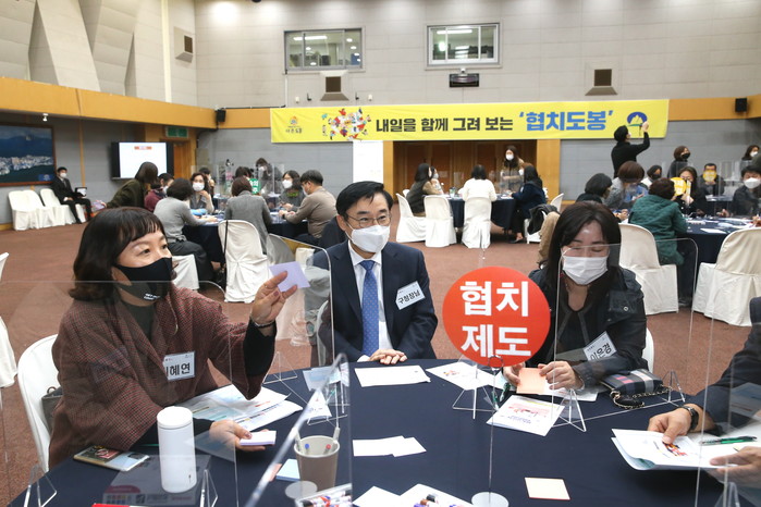 | ▲ 이동진 구청장이 2021년 6월 구청 선인봉홀에서 열린 협치도봉 회의에서 주민들과 의견을 주고받고 있는 모습. (사진제공=도봉구청) |