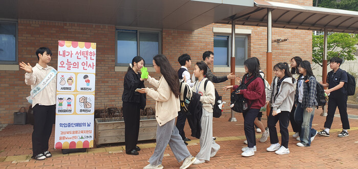 [울릉=백광태 기자] 울릉교육지원청(교육장 이동신) Wee센터는 2025학년도 1학기 학업중단 예방의 날 캠페인을 4월 22일, 23일 양일 동안 진행하였다. 대상은 울릉중학교(학교장 권오수)와 울릉고등학교(학교장 조영철) 전교생으로 등교하는 학생들에게 ‘우리 다 함께’ 캠페인을 실시하였다.