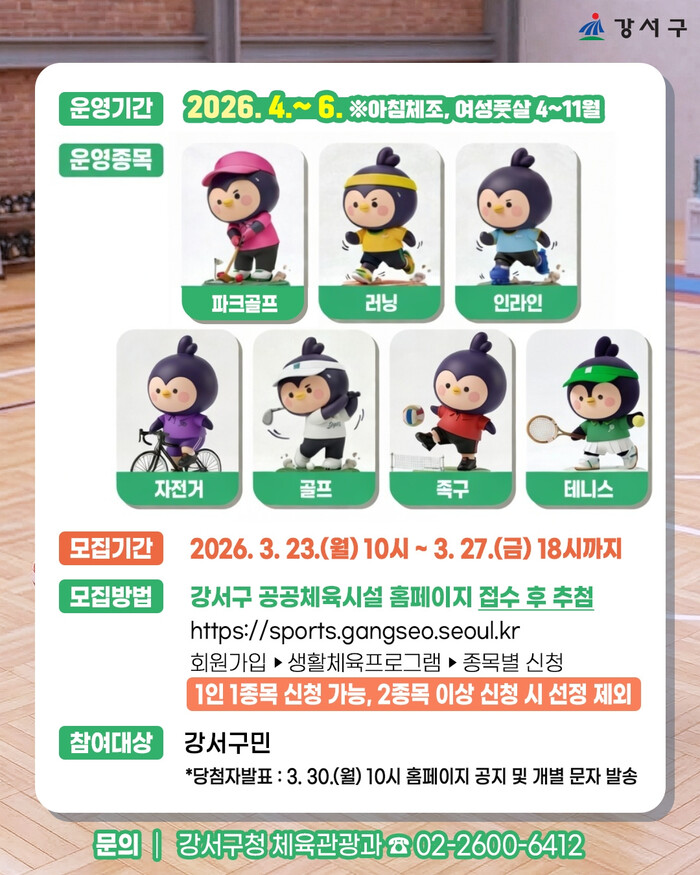 [시민일보 = 박소진 기자] 강서구(구청장 진교훈)는 구민의 건강한 일상을 지원하기 위해 오는 23일부터 27일까지 2026년 상반기 생활체육교실 참가자를 모집한다.