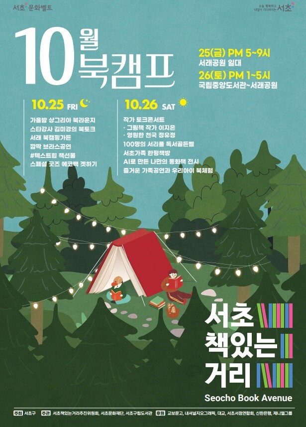 [시민일보 = 박소진 기자] 서초구(구청장 전성수)는 오는 25~26일 이틀간 서초책있는거리(국립중앙도서관~서래공원)에서 독서문화축제 '10월 북캠프'를 개최한다.
