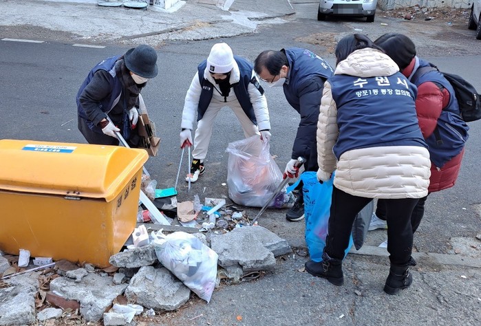 경기 수원시 영통구 망포1동은 최근 쾌적한 설 명절을 보낼 수 있도록 지역주민과 함께 일제 대청소를 실시했다. 참석자들은 주요 상가 및 다세대 주택가를 중심으로 불법 투기된 생활쓰레기 등을 집중 청소하고 인근 주민 대상으로 올바른 분리배출 방법을 홍보했다. 사진은 이날 봉사자들이 쓰레기를 치우고 있는 모습. (사진제공=영통구청)
