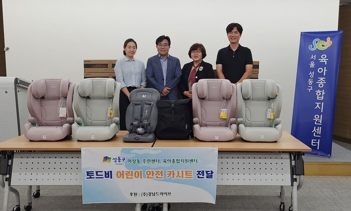 [시민일보 = 홍덕표 기자] 서울 성동구(구청장 정원오) 마장동이 지역내 기업인 (주)강남드라이브로부터 아이들을 위한 어린이 안전카시트를 기부받았다.