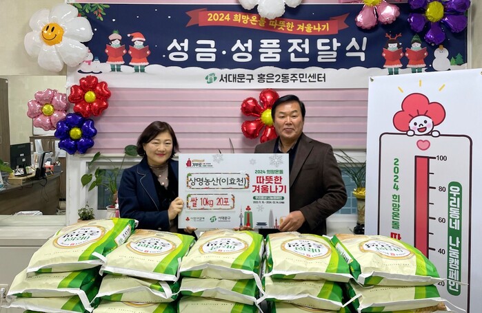 [시민일보 = 홍덕표 기자] 서울 서대문구 홍은2동은 지역내 소재한 ㈜상명농산이 연말을 맞아 저소득 가구를 위한 사랑의 쌀 10kg 20포를 후원해 주위에 귀감이 됐다고 21일 밝혔다.