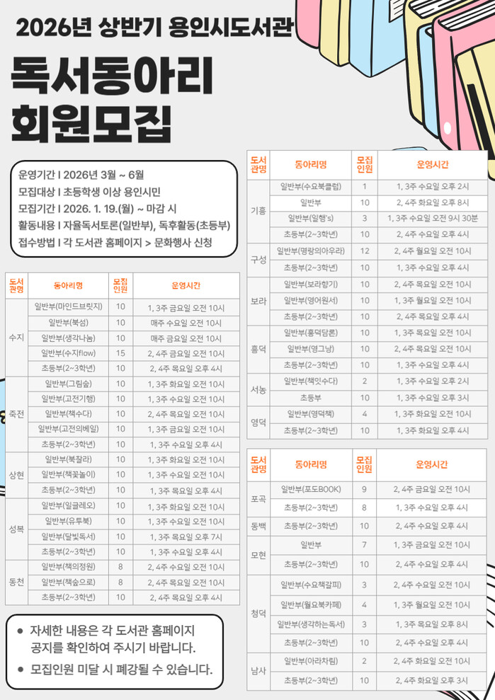 [용인=오왕석 기자] 용인특례시(시장 이상일)는 상반기 독서동아리 회원 409명을 모집한다고 6일 밝혔다.