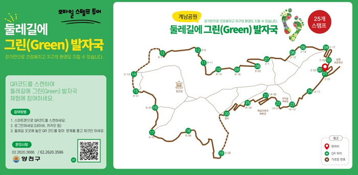 ‘둘레길에 그린(Green) 발자국’은 둘레길 산책 시 특정지점에 표출되는 기후·환경, 양천구 생태 등에 대한 문제를 맞혀가며 도장 25개를 모으는 스탬프 투어 프로그램이다. 문제를 푸는 과정에서 환경보전에 대한 기본 지식 습득과 운동 효과까지 누릴 수 있다.