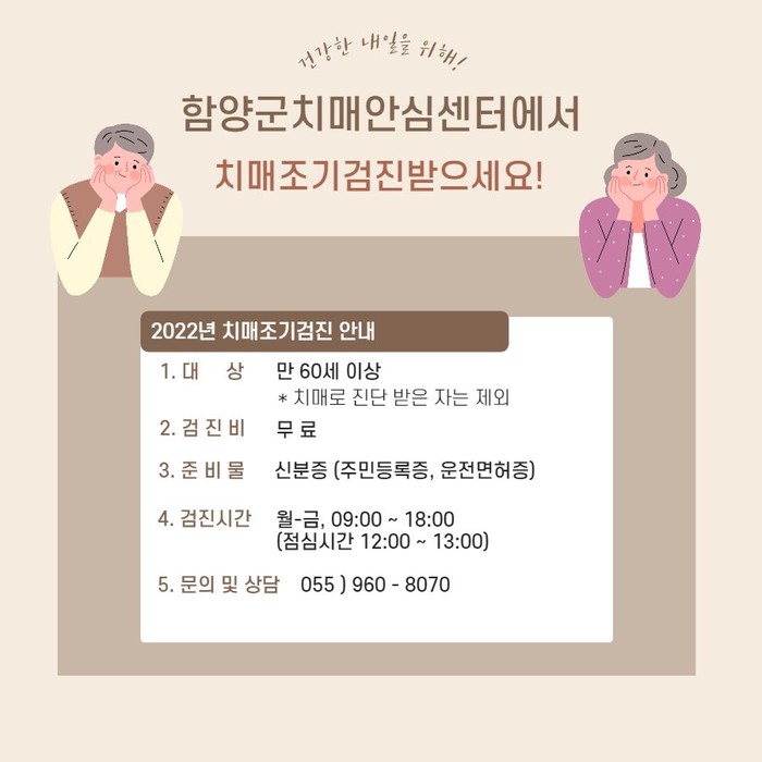 함양군보건소 치매안심센터에서는 치매환자를 조기에 발견하고 건강하고 활기찬 노후 생활을 할 수 있도록 만 60세 이상 주민 대상으로 무료 치매조기검진을 실시하고 있다.