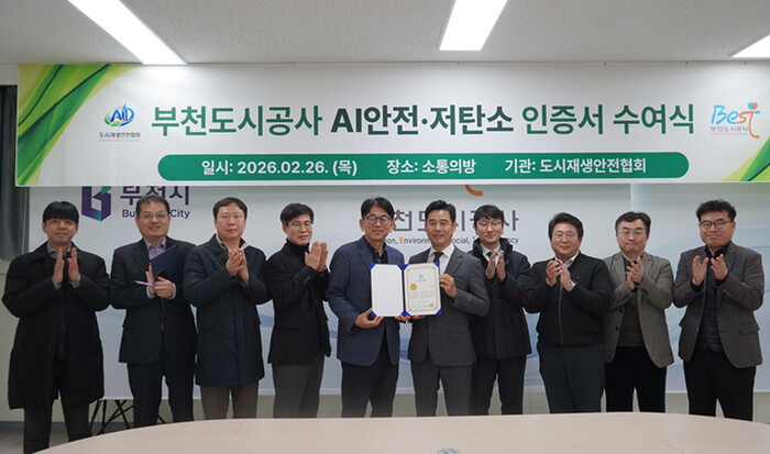 | 부천도시공사 AI 안전관리 인증서 수여식 참가자들이 포즈를 취하고 있다. [사진=부천도시공사] |