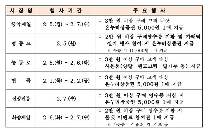 먼저, ‘면곡골목시장’과 ‘중곡제일시장’, ‘신성전통시장’은 각각 2월1일과 5일, 7일에 3만원 이상 구매 고객을 대상으로 온누리상품권 5000원을 지급한다.