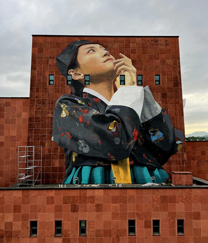 우측 연화지 방면 외벽의 아름다운 한복을 입은 여성 작품은 제목 ‘그의 시선과 너의 시선’을 통해 “세상을 향해 끊임없이 질문하고 문 두드리며 고개를 들고 있는” 작품 속의 인물과 작품을 감상하고 있는 우리의 모습이 다르지 않음을 알 수 있다.