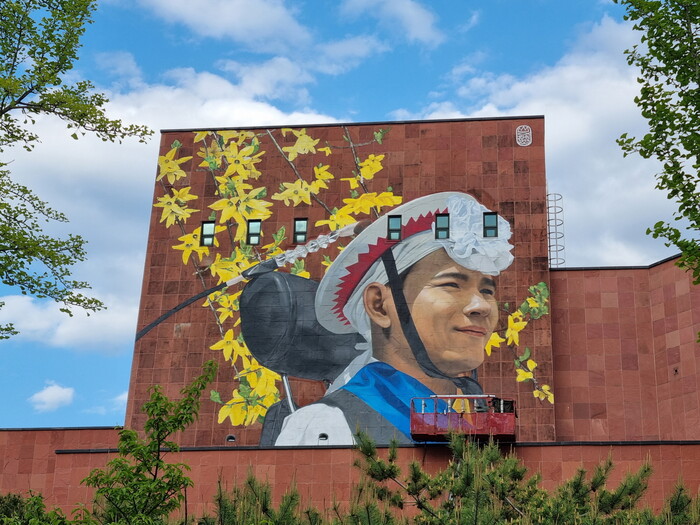심 씨는 지난 한 달여간 고향에 머물며 가로 15m, 세로 15m짜리 문화예술회관 외벽에 작품 2점을 그렸다. 작품 속 두 인물 모두 평범한 김천의 사람들이다.