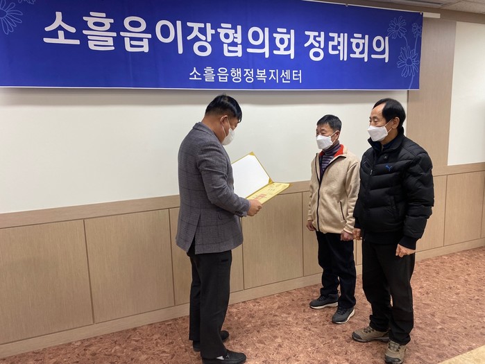 경기 포천시 소흘읍은 최근 ‘2022년 소흘읍이장협의회 첫 정례회의’를 개최해 시정 및 읍정 홍보사항을 전달받고 올 한 해 지역의 현안 사항에 대해 논의했다. 사진은 이날 이동교4리·무림2리 신임 이장 임명장 수여가 진행되고 있는 모습. (사진제공=포천시청)