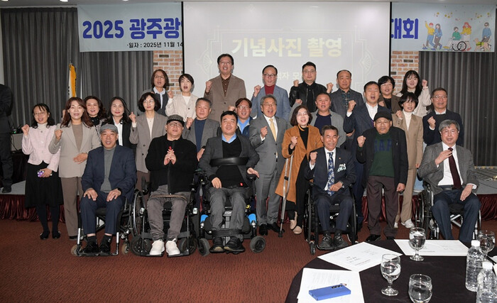[광주=정찬남 기자] 강기정 광주광역시장이 14일 오전 홀리데이인호텔에서 열린 장애인 자립생활 증진대회에 참석해 유공자 표창을 한 후 수상자들과 함께 기념촬영을 하고 있다. /광주광역시 제공