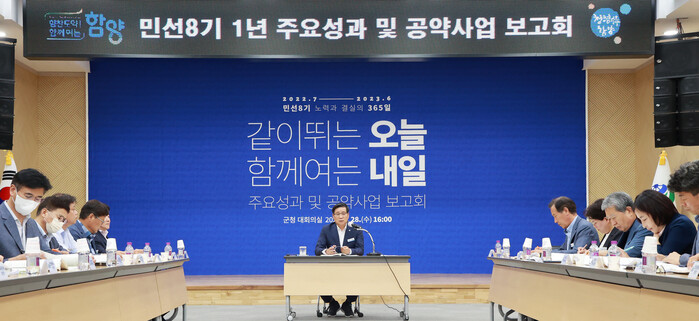 함양군은 28일 오후 군청 대회의실에서 ‘민선8기 1년 주요성과 및 공약사업 보고회’를 개최하고 지난 1년간 군정의 주요성과와 반성, 공약사업 점검, 향후 3년간 추진할 중점 사업과 정책을 공유했다.