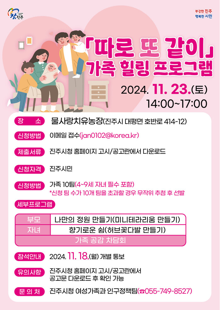 진주시는 출산과 양육에 친화적인 도시를 만들기 위해 오는 23일 대평면 물사랑치유농장에서 가족 힐링 프로그램‘따로 또 같이’를 개최한다.