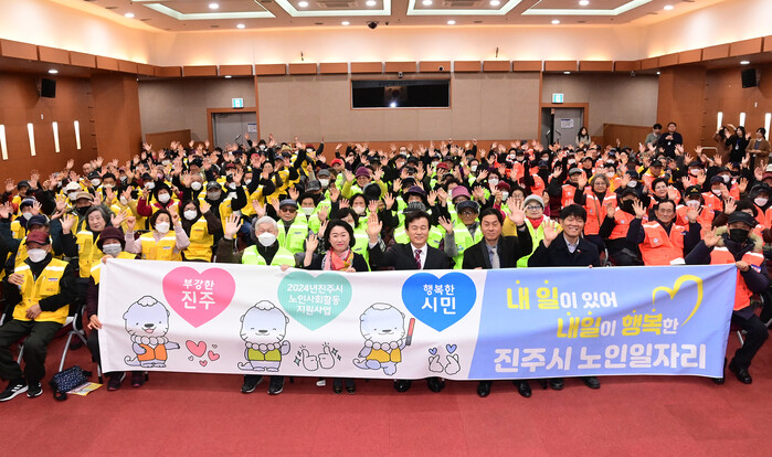 진주시는 29일 시청 시민홀에서 어르신들의 사회참여를 도모하고 경제적으로 안정적인 노후생활을 지원하기 위한 ‘2024년 노인일자리사업 발대식’을 개최했다.