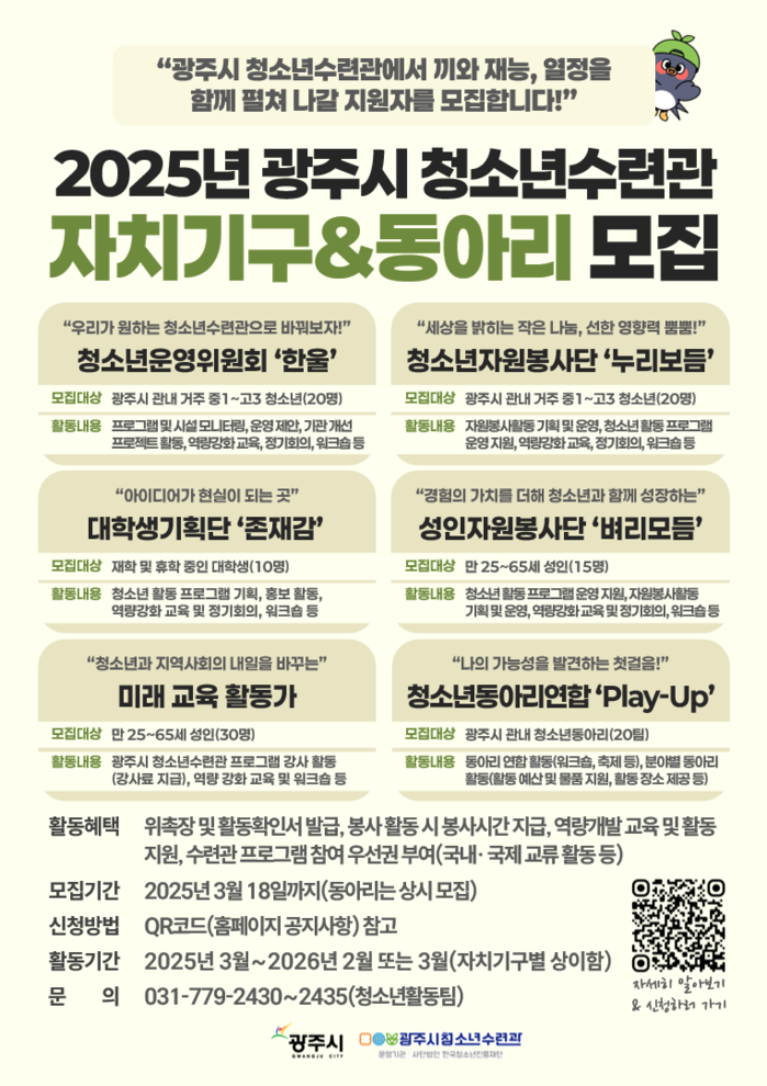 참가를 원하는 시민은 청소년수련관 홈페이지에서 QR코드를 통해 신청할 수 있으며, 모집하는 자치기구의 모집 대상과 활동 내용이 상이해 청소년 수련관 홈페이지에서 확인이 필요하다.