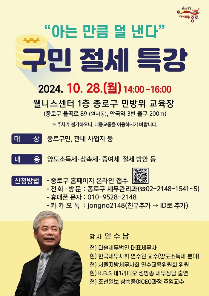 [시민일보 = 이대우 기자] 종로구(구청장 정문헌)가 오는 28일 오후 2~4시 웰니스센터 1층 종로구 민방위교육장(율곡로 89)에서 ‘아는 만큼 덜 낸다’ 구민 절세 특강을 개최한다.
