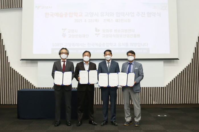 | ▲ 사진제공=고양시청/고양시-빛마루방송지원센터-고양문화재단-고양지식정보산업진흥원 한예종 유치 위한 협약 체결 |