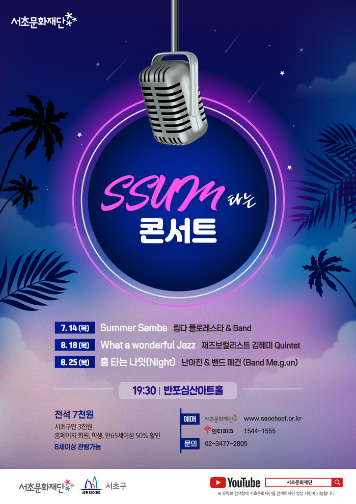 [시민일보 = 이대우 기자] 서초문화재단은 올 여름 시즌 서초에서 시원한 여름을 보낼 수 있도록 라틴, 팝, 재즈곡들로 구성된 <SSUM 타는 콘서트>를 새롭게 기획했다.