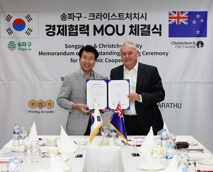 [시민일보 = 이대우 기자] 송파구(구청장 서강석)가 최근 올림픽파크텔에서 뉴질랜드 크라이스트처치시 시장과 면담을 진행하고, ‘송파구-크라이스트처치시 경제협력 MOU’를 체결했다고 25일 밝혔다.