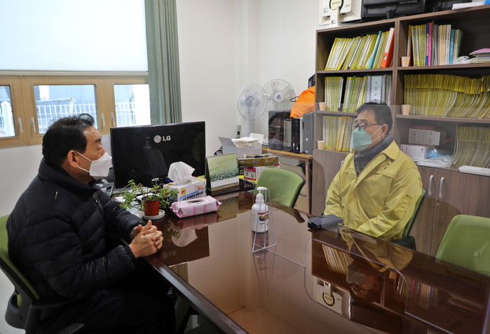 이귀만 경기 수원시 권선구청장은 최근 노인요양시설 2곳을 방문했다. 이 구청장은 코로나19 고위험시설 돌파감염 예방 유의사항 및 장기요양기관 입소자(이용자), 종사자들의 방역관리 유의사항 등을 전달하고, 운영 전반에 대한 애로사항과 건의사항을 청취하는 시간을 보냈다. 사진은 이 구청장(오른쪽)이 시설 관계자와 대화를 하고 있는 모습. (사진제공=권선구청)