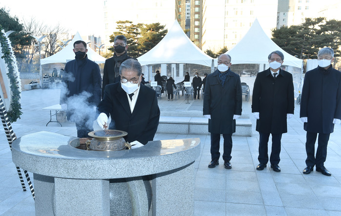 이재정 경기도교육감과 경기도교육청 간부들이 임인년 첫날인 지난 1일 경기 수원시 현충탑을 방문해 헌화·분향했다. 사진은 이 교육감(앞쪽)이 현충탑에서 분향을 하고 있는 모습. (사진제공=경기도교육청)