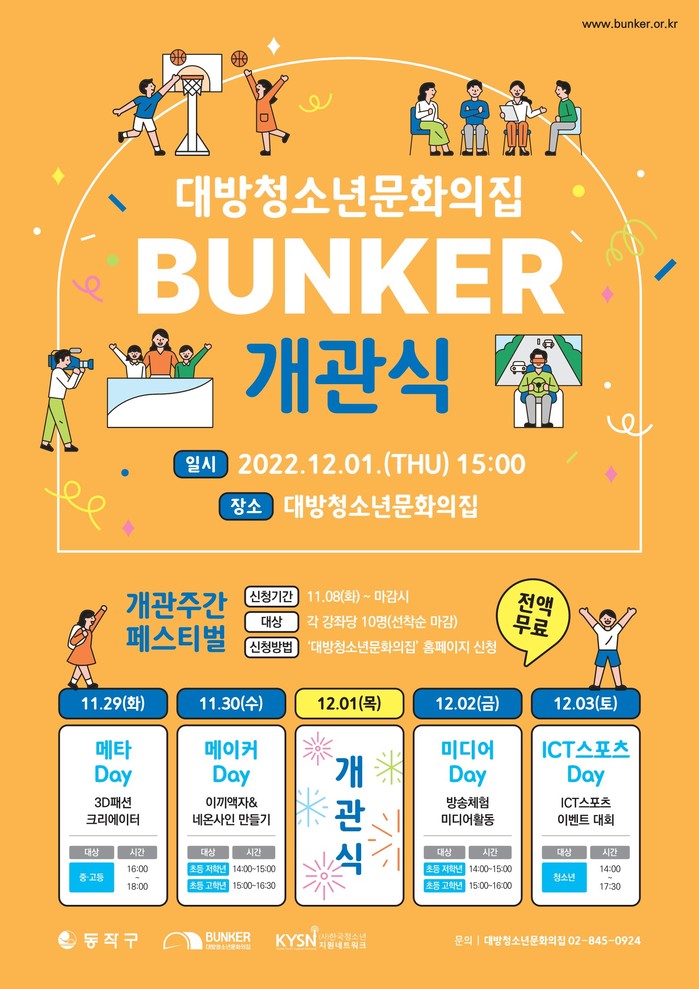 [시민일보 = 여영준 기자] 서울 동작구(구청장 박일하)는 오는 12월1일 대방청소년문화의집(애칭: 벙커) 개관식 행사를 개최하고 운영에 들어간다고 23일 밝혔다.