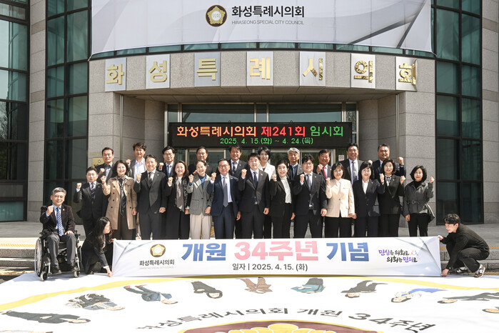 경기 화성시의회가 15일 시의회 본회의장에서 개원 34주년 기념식을 개최하고, 지난 의정 활동의 성과를 돌아보며 미래를 향한 새로운 도약의 의지를 다졌다. 사진은 기념촬영을 하고 있는 시의원들의 모습. (사진=화성시의회 제공)