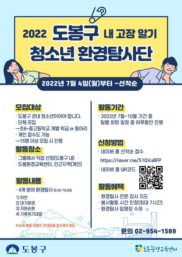 4일부터 선착순으로 모집 중이며, 신청을 원하는 경우 사진 상의 QR코드를 통해 신청서를 제출하면 된다. 기타 자세한 사항은 도봉환경교육센터로 문의하면 된다.