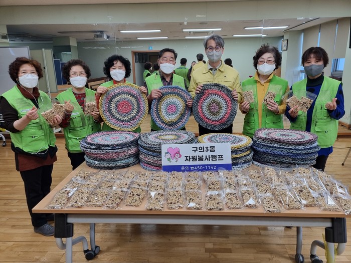 광진구 구의3동 주민센터와 구의3동 자원봉사캠프가 지난 7일 광진구 재난안전대책본부 근무자들을 위해 수제간식과 양말목방석을 전달했다. 사진은 관계자들이 기념촬영을 하는 모습. (사진제공=광진구청)