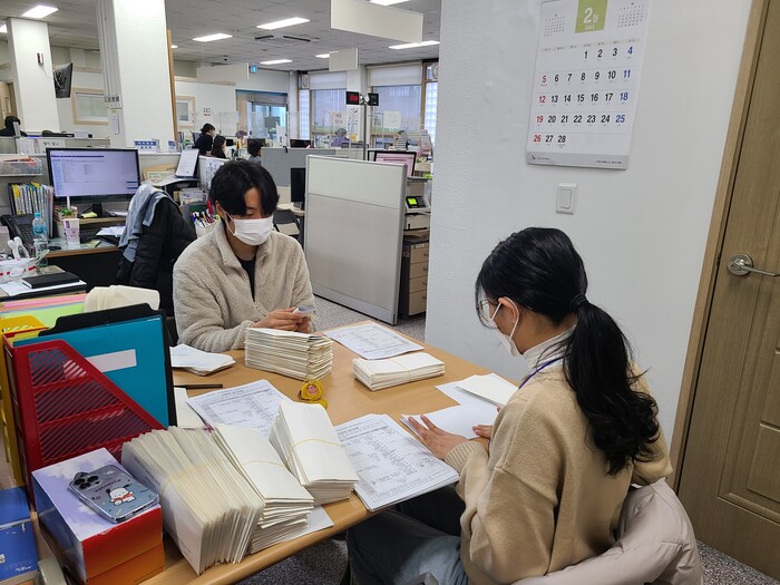 | ▲ 지난 겨울 대학생 행정·복지체험단으로 선정된 학생들이 업무를 하고 있는 모습. (사진=강서구청 제공) |