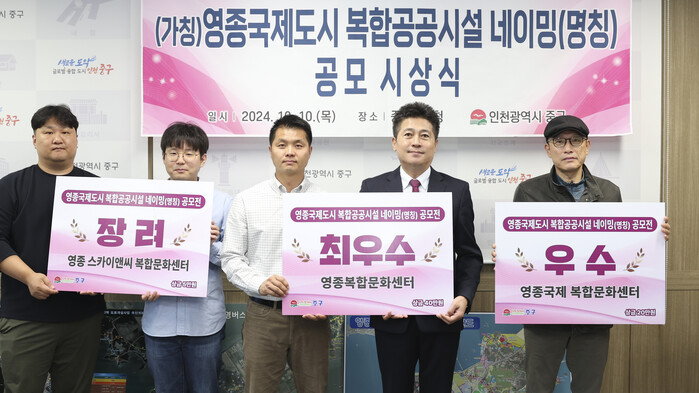 [인천=문찬식 기자] 인천 중구(구청장 김정헌)는 ‘(가칭) 영종국제도시 복합공공시설 명칭 공모전’의 최우수상으로 ‘영종복합문화센터’를 선정했다고 밝혔다.