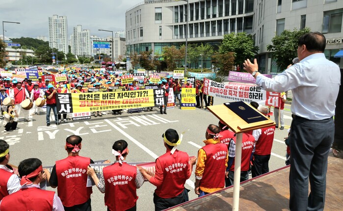 여한훈 위원장은 “그동안 환경부가 합천군민들에게 커다란 실망감을 안겨 주고 지역주민 동의 없이는 사업을 추진하지 않겠다고 하면서 계속 용역을 진행하는 것은 합천군민을 우롱하는 처사다. 왜 우리가 오늘 농사를 팽개치고 여기 와서 울부 짖는가를 알아야 된다”고 울분을 토하며 삭발로 투쟁의지를 다졌다.조삼술 군의회 의장도 삭발식에 동참하여 황강취수장 결사반대의 결연한 의지를 보였다.