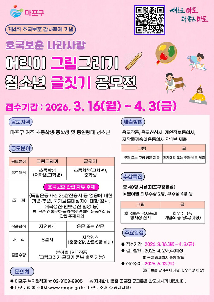 [시민일보 = 문민호 기자] 마포구(구청장 박강수)는 제4회 호국보훈 감사축제를 맞아 어린이와 청소년이 국가보훈대상자의 희생과 헌신을 기억하고 나라사랑의 의미를 되새길 수 있도록 ‘호국보훈·나라사랑 어린이 그림그리기·청소년 글짓기 공모전’을 개최한다.