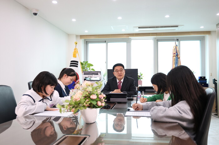| ▲ 어린이 기자들이 문헌일 구청장과 인터뷰를 진행하고 있다. (사진=구로구청 제공) |