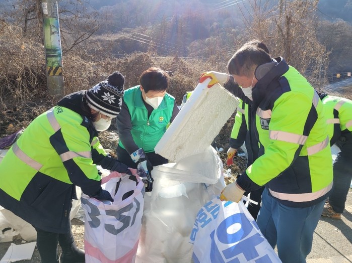 새마을교통봉사대남양주시지대는 26일 경기 남양주시 화도읍 창현리에서 무단 투기 제로를 위한 환경 정화 활동을 펼쳐 무단 투기된 쓰레기 약 3톤 분량을 일일이 분리 작업해 모두 수거했다. 사진은 이날 봉사자들이 쓰레기를 수거하고 있는 모습. (사진제공=남양주시청)