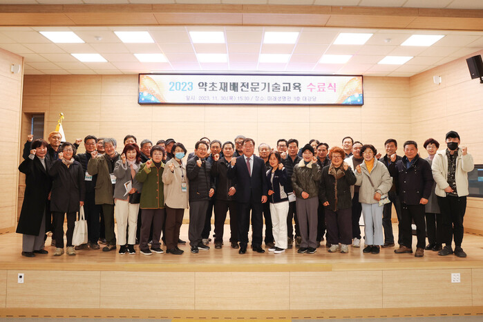 군은 최근 농업기술센터 미래생명관 대강당에서 ‘2023년 약초재배 전문기술교육 수료식’을 개최했다고 3일 밝혔다.