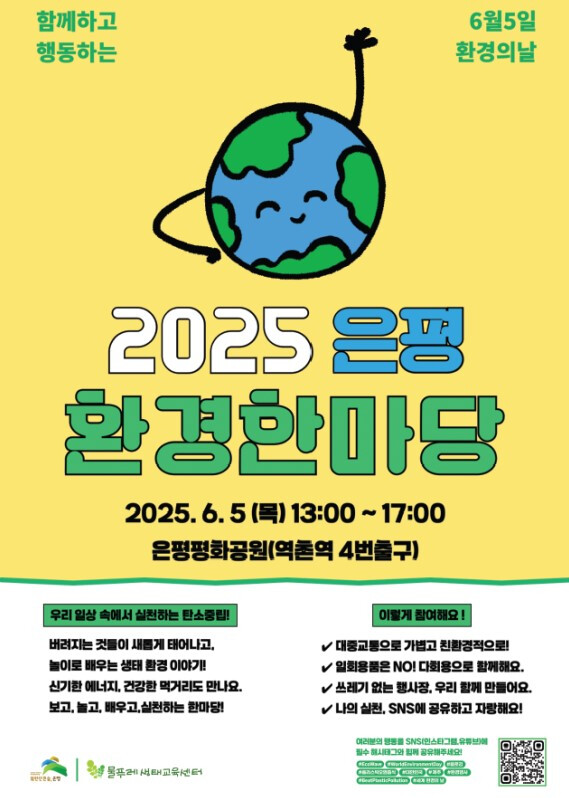 구는 이번 행사를 통해 환경 활동가와 기관 간의 연대와 협력, 그리고 지역사회와의 지속적인 소통과 교류의 장이 마련되길 기대한다. 행사는 오는 5일 은평평화공원에서 오후 1~5시 개최되며, 남녀노소 누구나 자유롭게 참여할 수 있다.