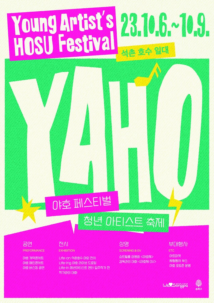 서 구청장은 “‘야호 페스티벌’에 오셔서 청년예술인들에게 많은 관심과 응원을 보내주시고, 깊어가는 가을에 송파에서 잊지 못할 추억도 만들어 보시기 바란다”고 전했다.