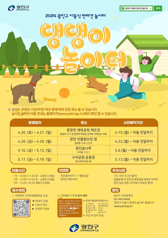 행사의 안전성을 위해 기상 여건에 따라 운영 일정 등이 변동될 수 있으니, 댕댕이 놀이터 이용 안내는 누리집에서 확인하면 된다.