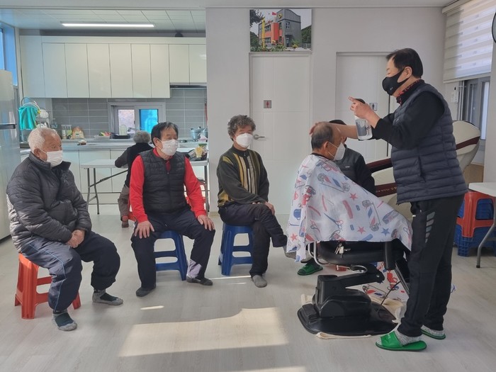경기 동두천시 보산동 행정복지센터는 18일 걸산동 노인 10여명을 대상으로 이발봉사를 했다. 사진은 잔디이발관 대표 김노경씨가 재능기부로 노인들을 대상으로 이발봉사를 하고 있는 모습. (사진제공=동두천시청)