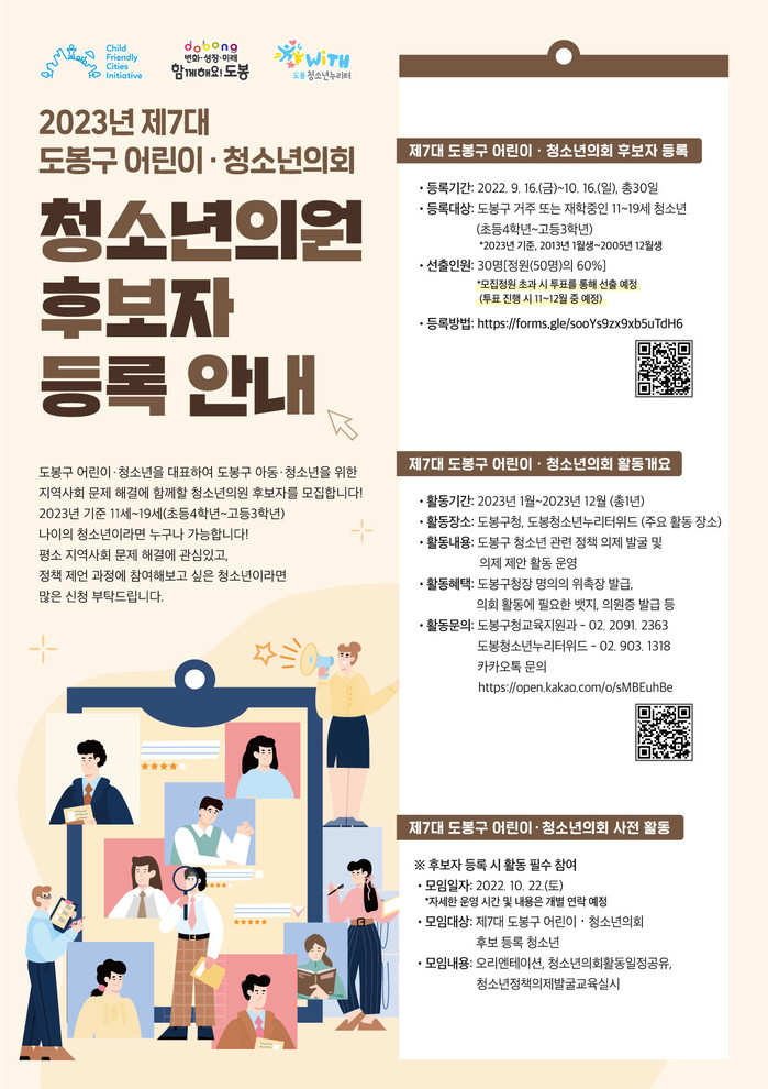 [시민일보 = 박준우 기자] 도봉구(구청장 오언석)가 2023년 제7대 도봉구 어린이 청소년의회 의원 모집을 지난 16일부터 오는 10월16일까지 진행한다.