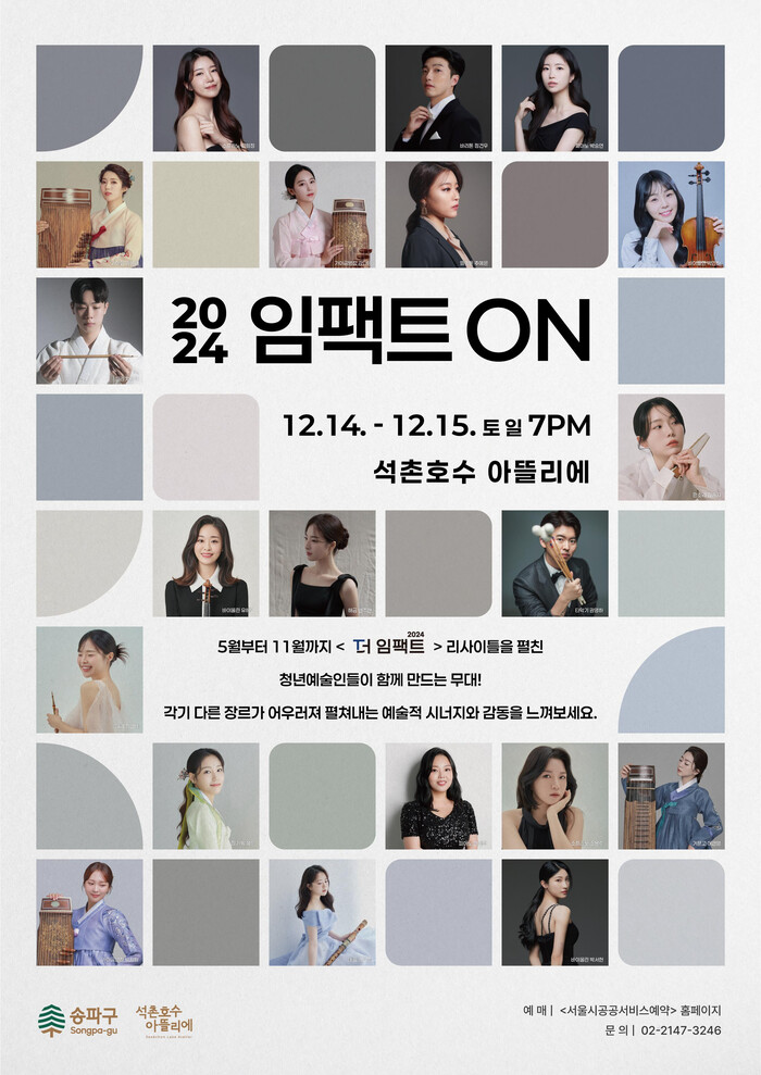 우선 14~15일 오후 7시에는 ‘석촌호수 아뜰리에’에서 ▲청년예술인 연말합동콘서트 ‘임팩트ON’을 개최한다.